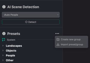 There are two sections in Workbench: AI Scene Detection and Other Presets. The AI Scene Detection models allow you to use AI to determine the contents of the image and automatically choose the best preset for the image. These groups are made up of multiple presets the AI can choose from. Other Presets are single, individual presets. We recommend AI Scene Detetion because it is more robust, but there is still the option to use one individual preset instead.