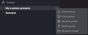 To export an individual preset into a .preset file, select the preset you would like to use in the SDK, WebAPI, or Container, then switch to List View in the “Other Presets” Panel, then click the three dots, and click Export Preset.