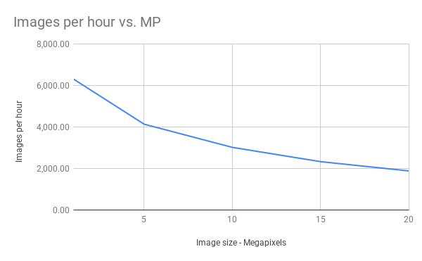 While larger images take longer to process, there is a fixed amount of processing that must occur for each image. As such, larger images are faster per megapixel than smaller images. The chart below shows this relationship.